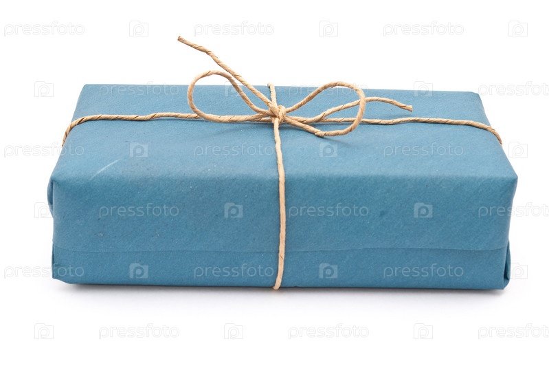 Подарок, завернутый в синий материал. Белый фон