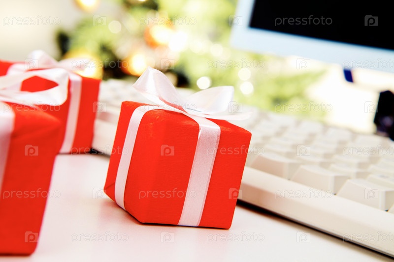 Маленькие подарочные коробочки рядом с компьютерной клавиатурой