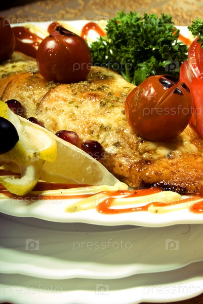 Жареное филе рыбы с лимоном и овощами