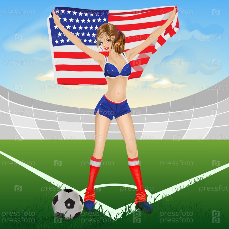 Молодая девушка в купальнике с американским флагом в руках на футбольном поле