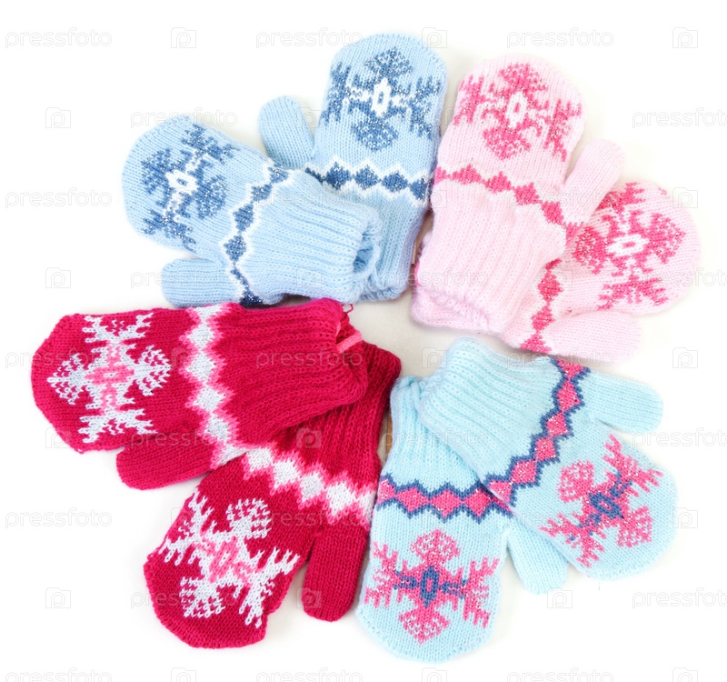 Детские варежки с узором, выложенные веером по кругу на белом фоне