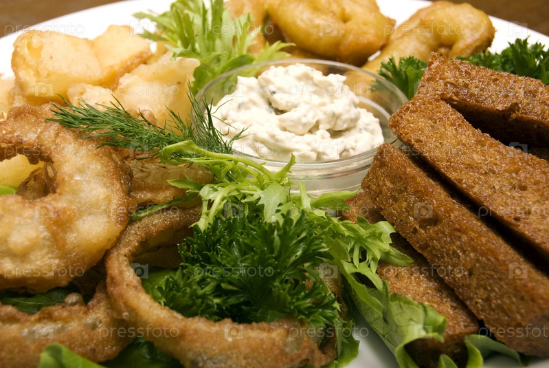 Жареный хлеб, кольца лука и картофель с соусом