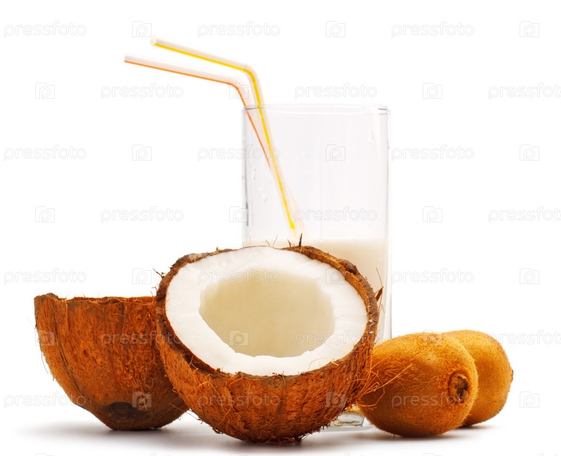 Половинки кокоса, киви и стакан с кокосовым молоком