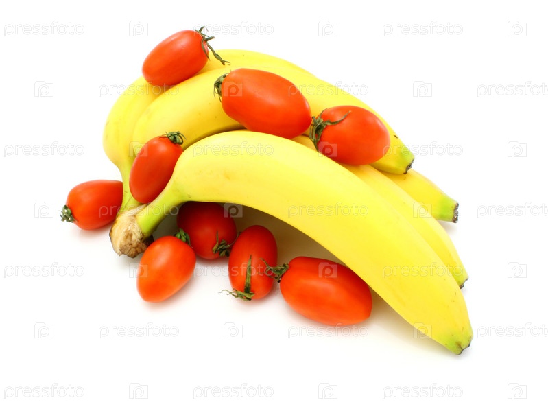 Спелые бананы и помидоры на белом фоне