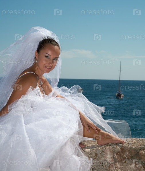 Невеста в свадебном платье на берегу Черного моря