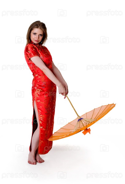 Женщина в традиционном японском красном платье с зонтиком