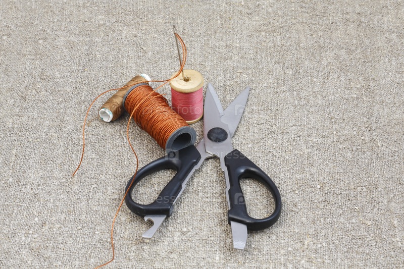 Три катушки ниток, иголка и ножницы на серой ткани