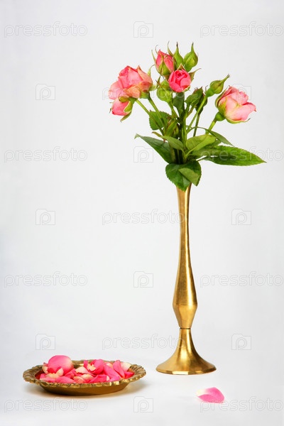Ваза с розами и лепестки роз на тарелке