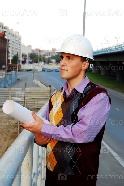 Молодой строитель в каске с чертежом