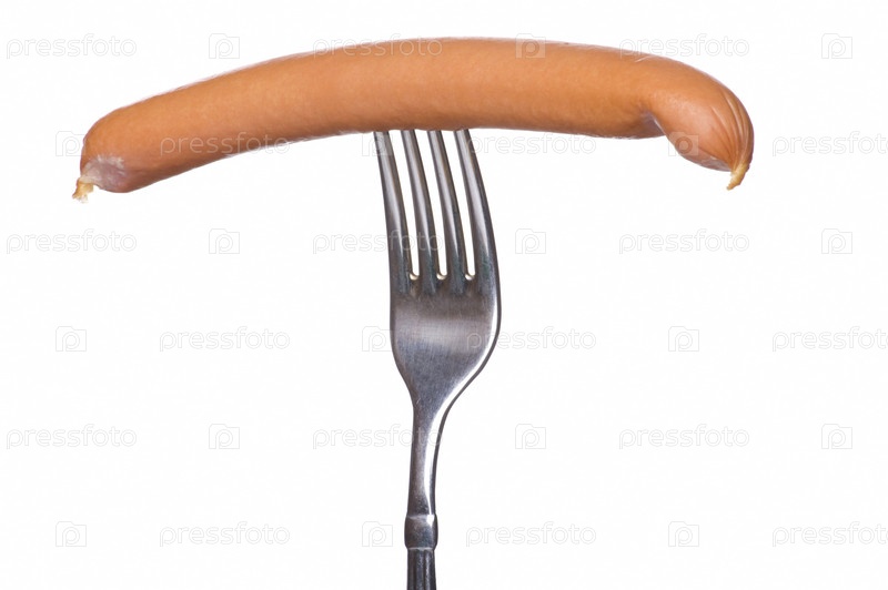 Сосиска на вилке, изолировано на белом фоне