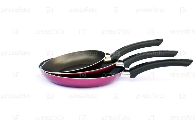 Три розовые сковородки на белом фоне
