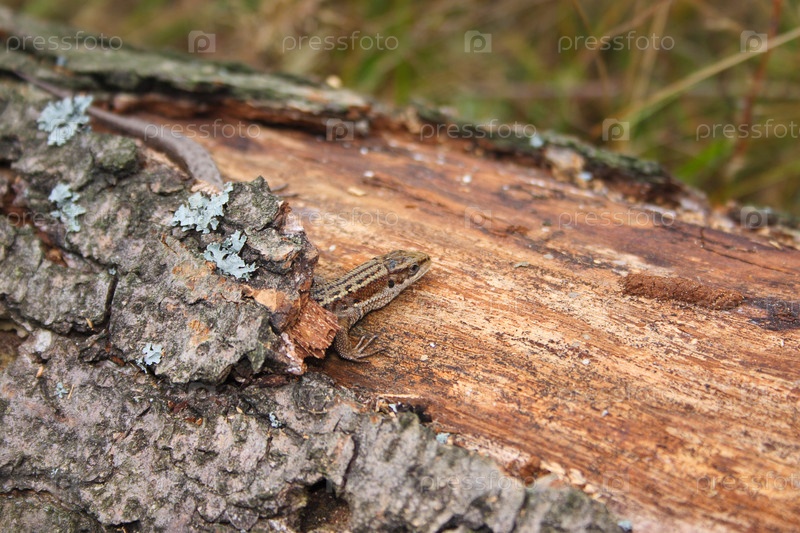 Ящерица на бревне, которая выросла с удаленным мхом вблизи