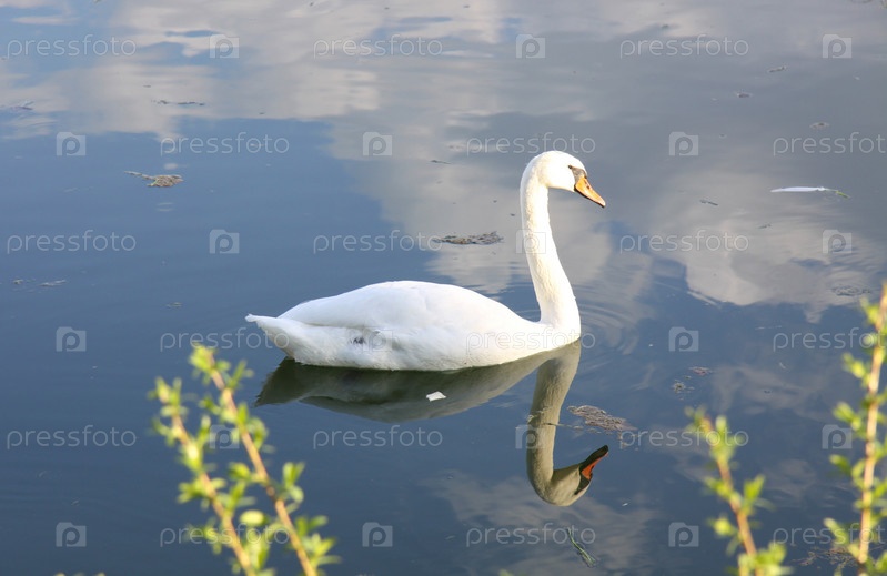 Белый лебедь плывет по озеру