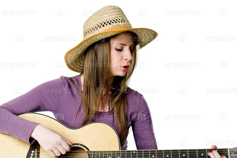 Молодая девушка в соломенной шляпе, играющая на гитаре