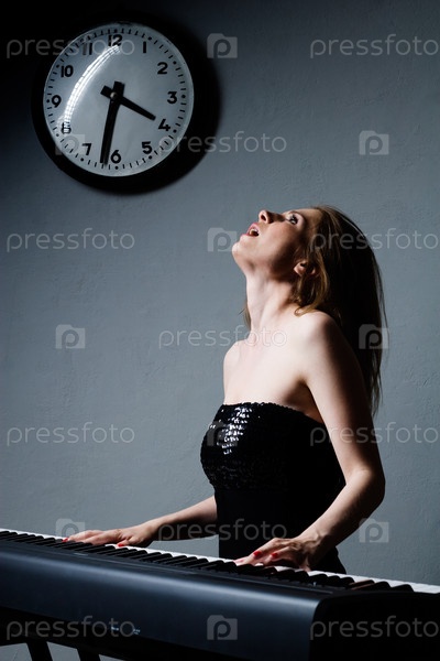 Девушка в черном платье играет на синтезаторе