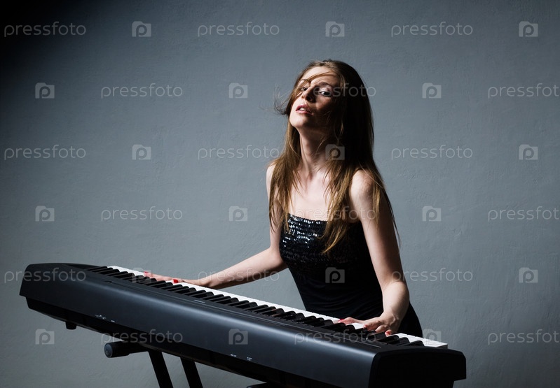 Девушка в черном платье играет на синтезаторе