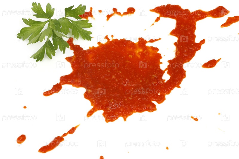 Пятно томатного соуса с веточкой петрушки на белом фоне