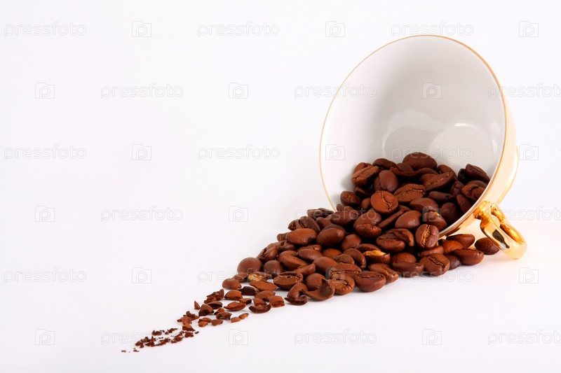 Кофейные зерна рассыпаны из опрокинутой чашки на белом фоне