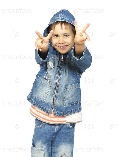 Маленький мальчик в джинсовом костюме японской национальности на белом фоне