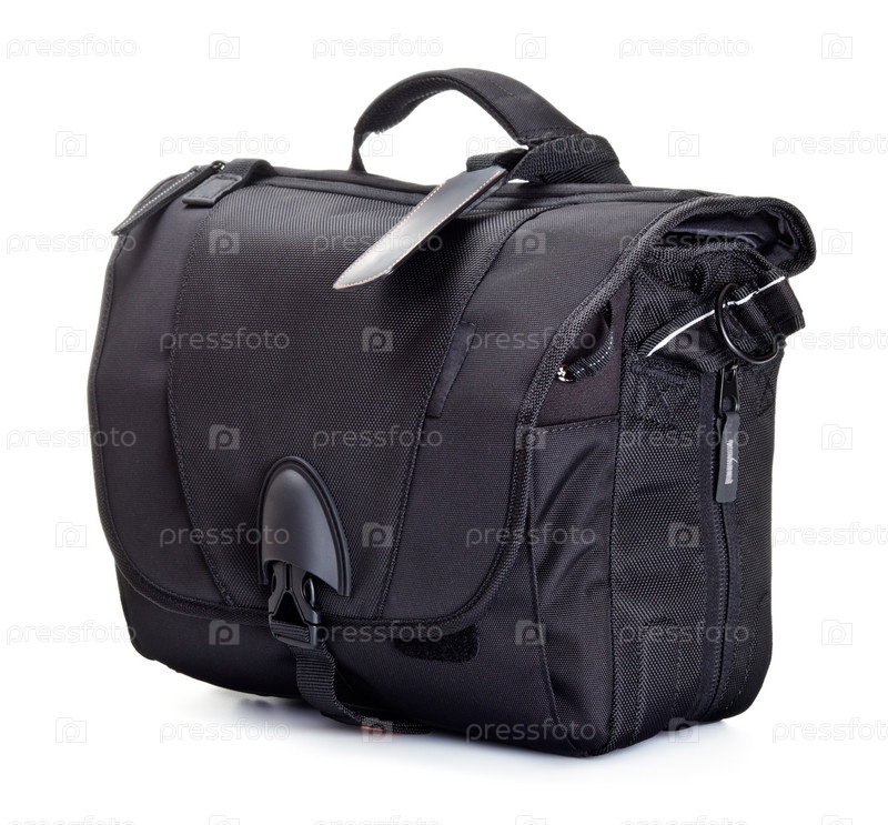 Черная сумка для фотоаксессуаров на белом фоне