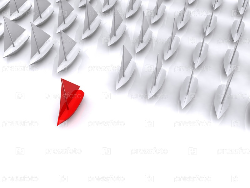 Красный кораблик впереди серых на белом фоне