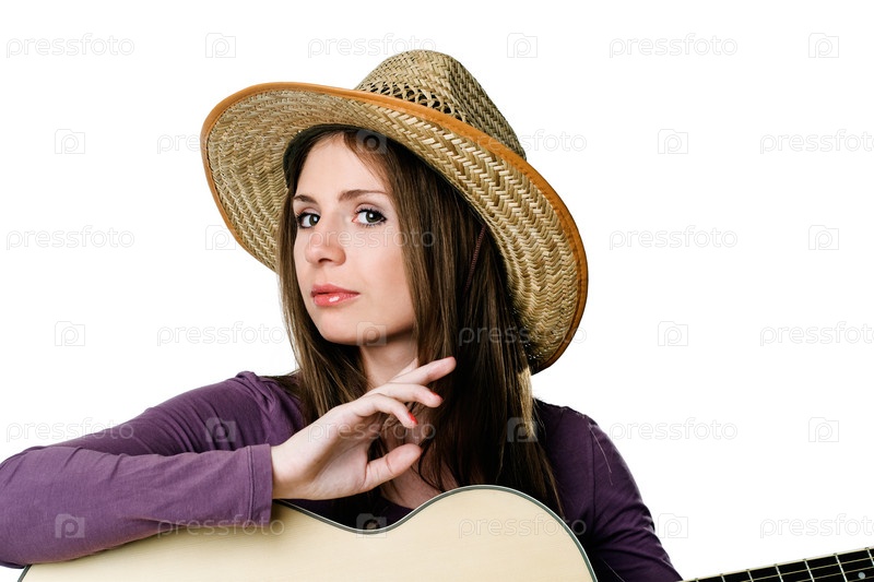 Молодая девушка в шляпе с гитарой