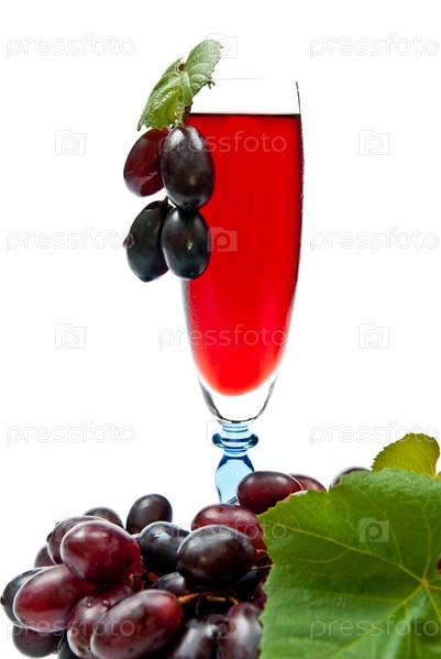Красное вино и гроздь винограда на белом фоне
