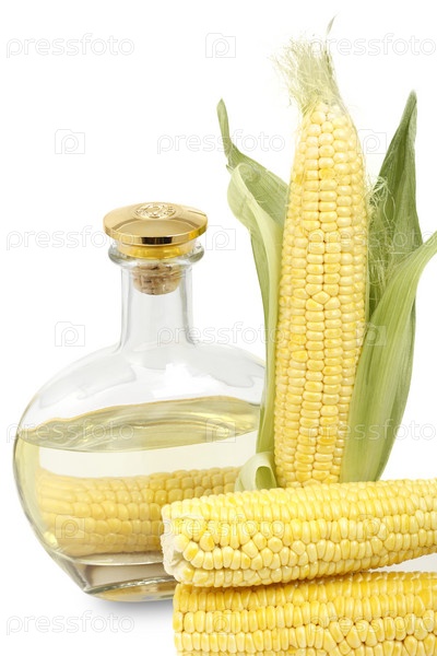 Початки кукурузы и бутылка кукурузного масла на белом фоне