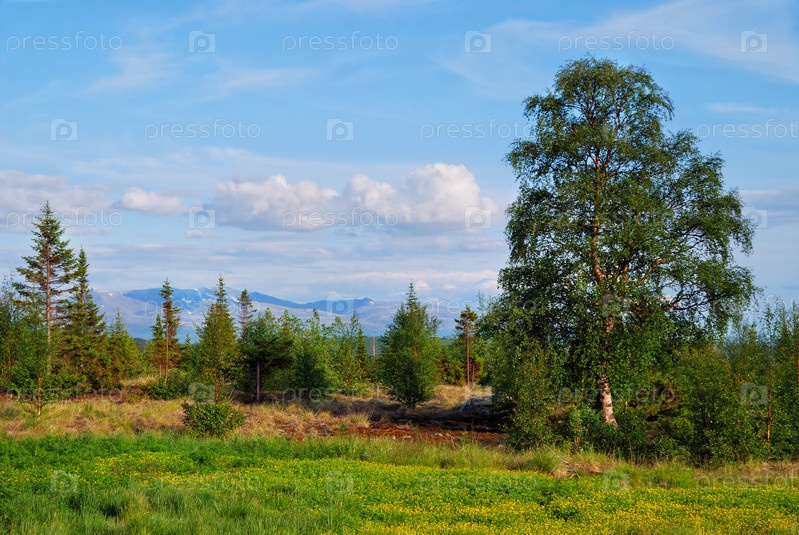 Летний пейзаж с березой и горами