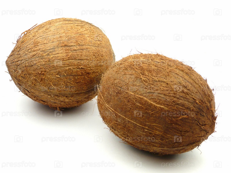 Два спелых кокоса на белом фоне