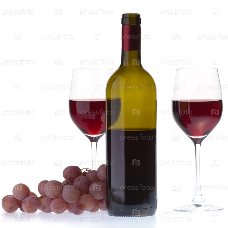 Бутылка красного вина, два бокала и виноградная гроздь