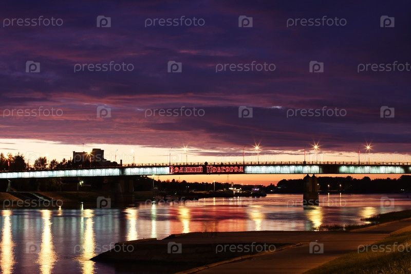 Ночной пейзаж на реке Волхов в Великом Новгороде