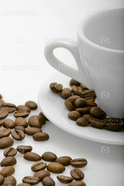 Пустая чашка с блюдцем и кофейные зерна на белом фоне