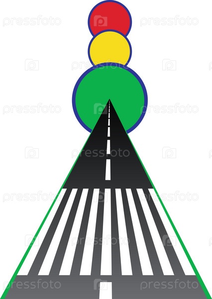 Символичное изображение уходящей в даль дороги и светофора. Изоляция на белом фоне