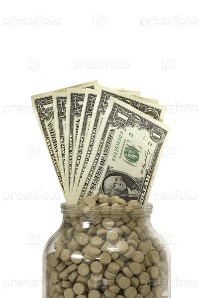 Стеклянная бутылка с травяными таблетками и долларами