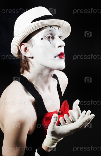 Клоун-мим в белой шляпе на черном фоне
