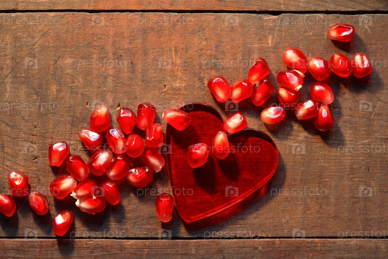 Здоровье. Красное стеклянное сердце и зерна граната на деревянном фоне