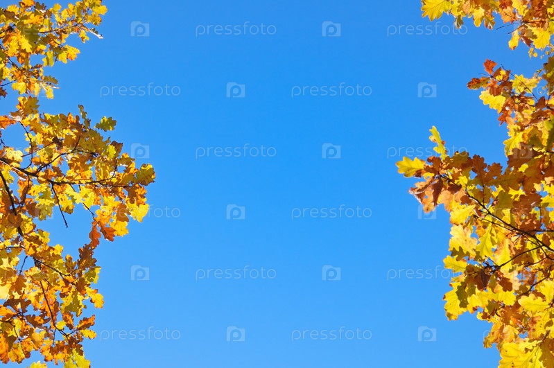 Осенние дубовые листья на фоне голубого неба