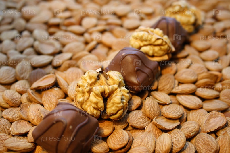Шоколадные конфеты и орехи рядом друг с другом на линии