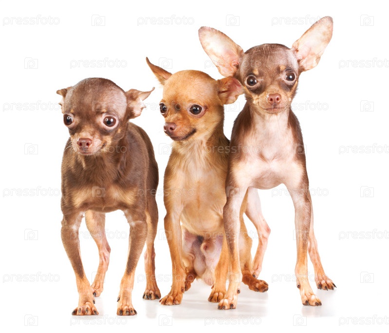 Три собаки породы русский той терьер на белом фоне