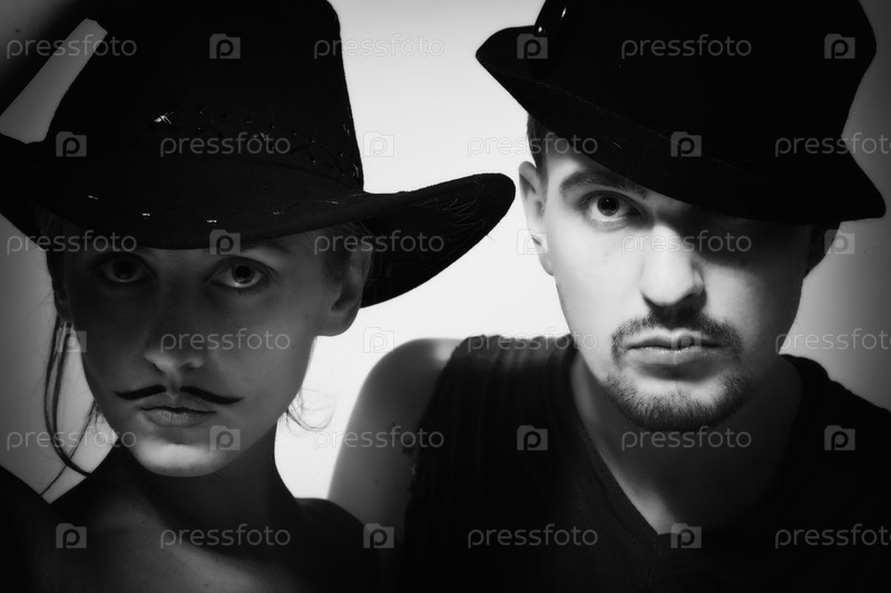 Портрет девушки с нарисованными усами и парня в темных шляпах