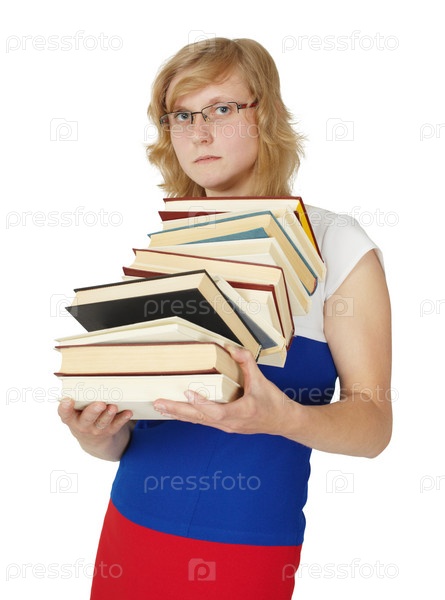 Женщина в платье цвета российского флага с книгами