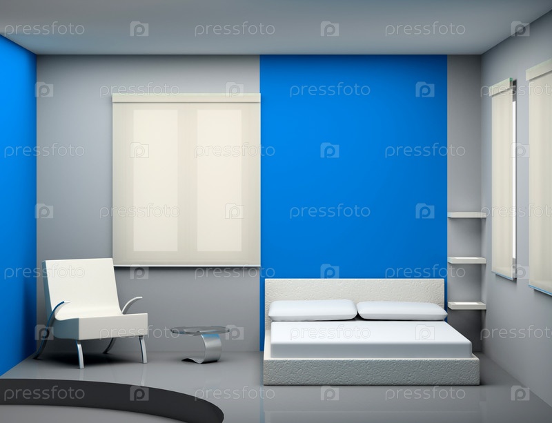 Современный интерьер спальни с кроватью и креслом