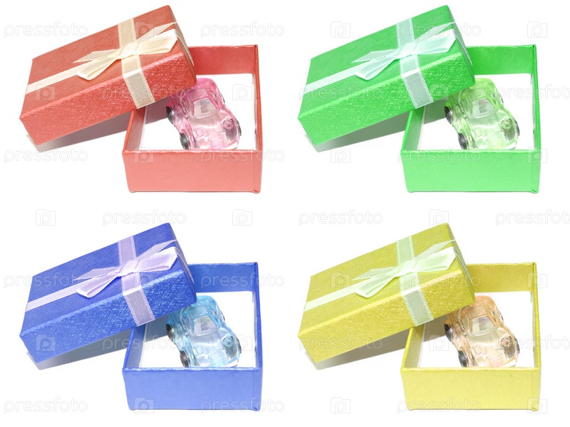 Разноцветные подарочные коробки с автомобилями на белом фоне