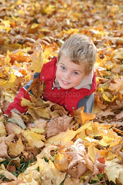 Ребенок среди упавших листьев
