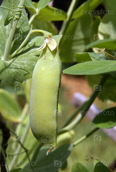 На ветке плод растущего зеленого гороха