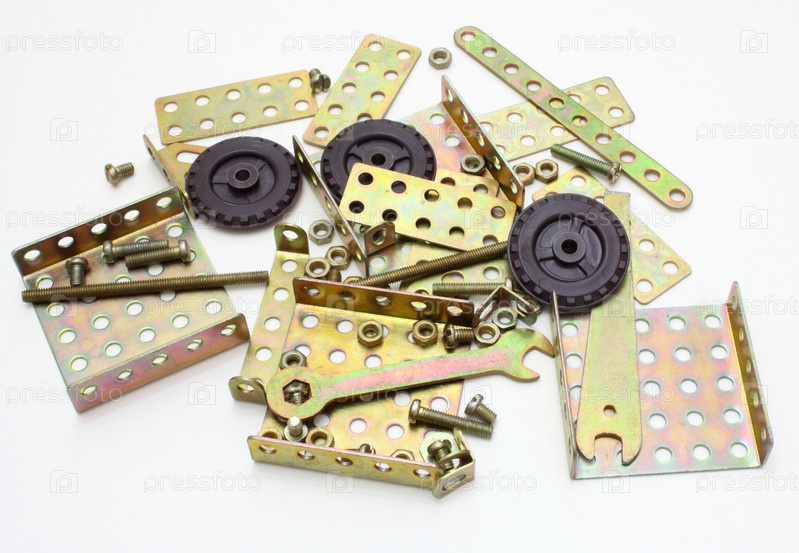Детский металлический конструктор с деталями на белом фоне
