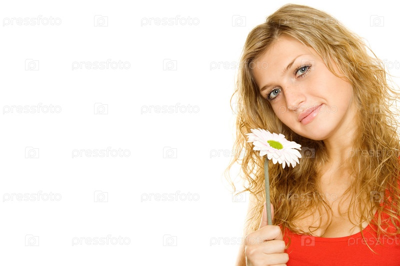 Молодая девушка с ромашкой в руке на белом фоне