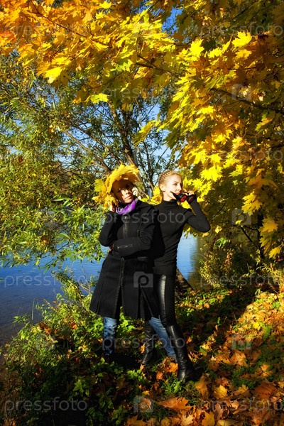 Две молодые женщины в осеннем парке у реки