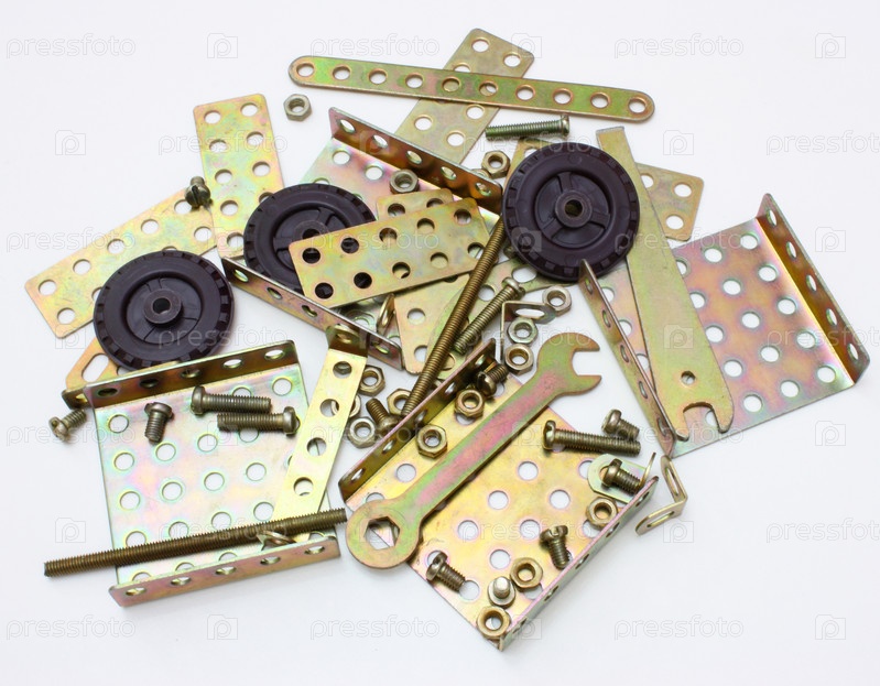 Детали детского металлического конструктора на белом фоне